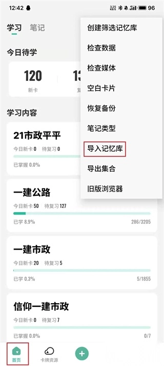 点击首页后,找到右上角的三个点,点击它,然后选择导入记忆库,再挑选团长分享给你的卡牌。