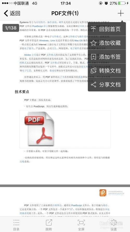 打开文档后,可对当前文档进行收藏、添加书签以及分享文档的操作。