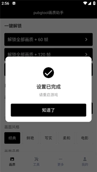 1、启动pubgtool画质助手应用,进入一键设置页面,点击【调整为全画质+120帧】选项。