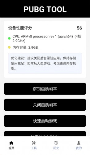 1、打开PubgTool画质助手首页,这里提供解锁画质帧率、关闭画质帧率、快速启动游戏等服务。