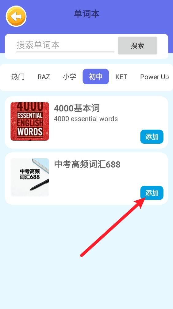 5、比如切换至"初中"板块,涵盖基本词和中考高频词,点击"添加"即可。