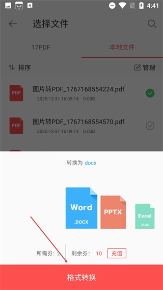 4、选择目标格式(如【docx】),确认所需转换券充足后,点击【格式转换】按钮即可启动文件格式转换流程。