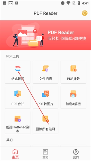 1、进入【PDF Reader】首页,选择【格式转换】功能(支持PDF与多格式互转),即可进入格式转换的操作页面。