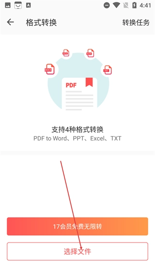 2、在【格式转换】页,确认支持PDF转Word/PPT等4种格式后,点击【选择文件】按钮,进入本地文件选择界面。