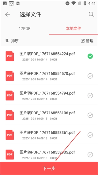 3、在【选择文件】页,勾选需转换的PDF文件(如图片转PDF生成的文件),确认后点击【下一步】进入格式选择环节。