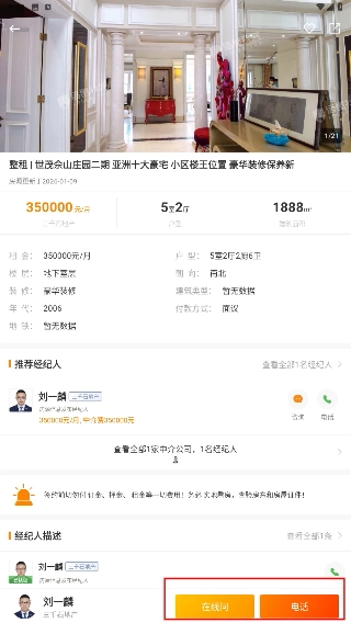 4、进入房源详情页后,可点击【在线问】或【电话】按钮,直接与该房源的经纪人取得联系,咨询相关问题。