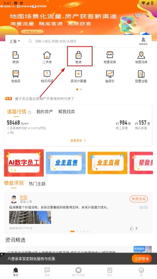 2、进入主界面后,点击顶部的【租房】功能入口,即可切换到租房服务板块,浏览相关资源和功能。