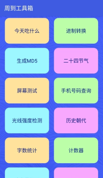 周到工具箱是一款生活实用类软件,功能十分丰富,它把各种各样的工具都整合到了一起,感觉作者想到什么就往里面加什么似的~不知道今天吃啥?可以试试它;不会算进制?可以试试它;想检测屏幕?可以试试它...里面的内容真的特别多,还有字数统计、计数器、历史朝代、二十四节气、生成MD5等诸多功能。虽然塞了这么多内容进去,它的大小却依然没超过50M,一点都不占存储空间,挺不错的。