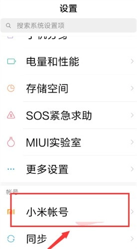 2、进入设置的主界面后,找到【小米账号】这一选项,点击将其打开。