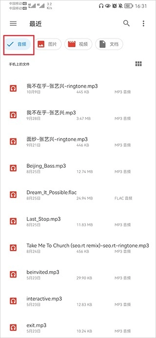 3、然后点击音频后,就可以看到手机中的音频文件。