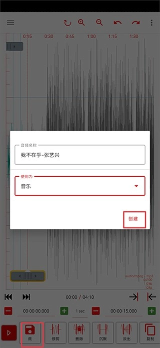 5、最后进行音频剪辑即可,修剪完成后点击救,并创建后即可保存。