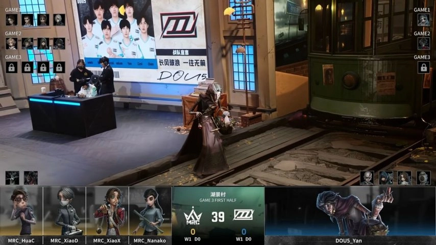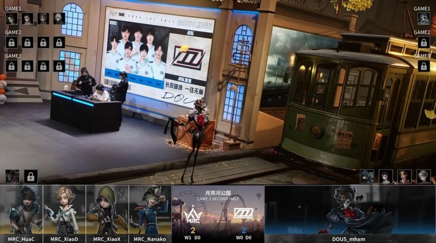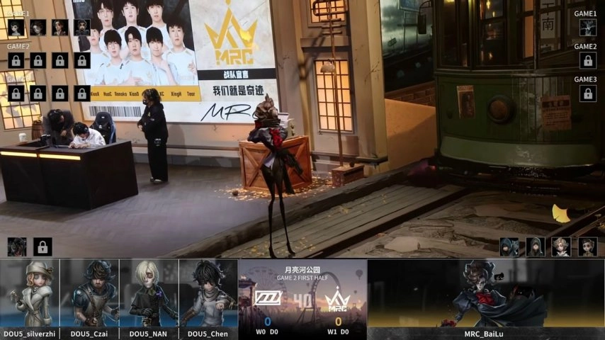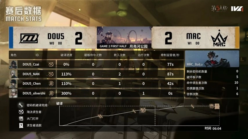 MRC战队的求生者阵营选用了幸运儿、入殓师、大副与古董商,并禁用了时空之影和“跛脚羊”;DOU5战队的监管者选手Yan则选择了杂货商,同时禁用了“逃脱大师”、先知、“心理学家”以及昆虫学者。