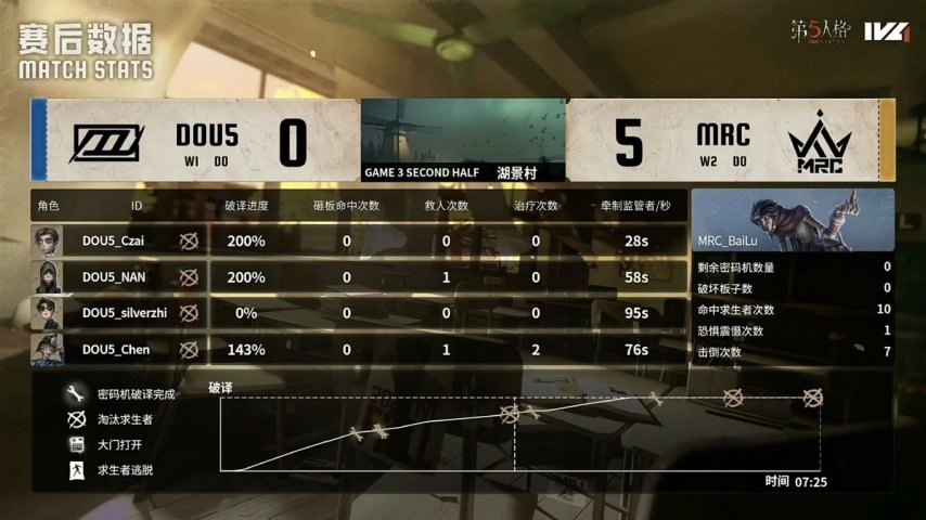DOU5的求生者阵营选出了“法罗女士”、飞行家、守墓人、病患,并禁用了“跛脚羊”;MRC的监管者选手BaiLu则选定了歌剧演员,同时禁用了先知、佣兵、气象学家与空军。
