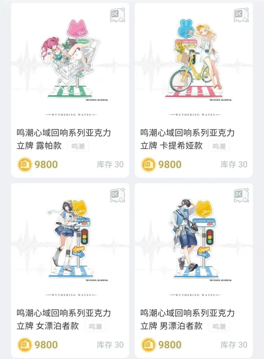 首先要和大家说的是明天即将更新的库街区鸣潮周边兑换商城,兑换开启时间是9月30日中午12点,这次的周边产品还是两款,一款是心域回响系列亚克力立牌,另一款是嘉年华主题的亚克力立牌,它们的兑换价格都是9800库洛币。