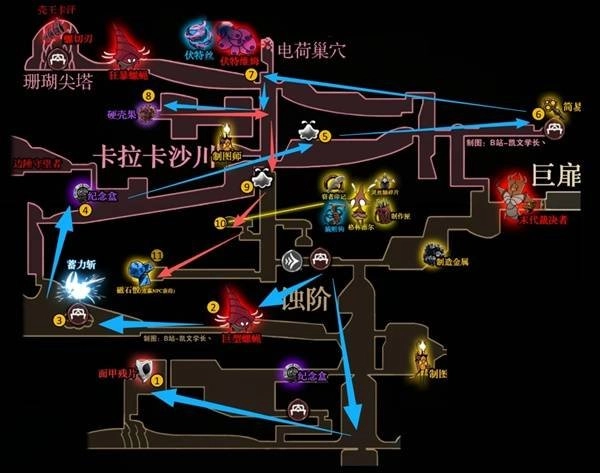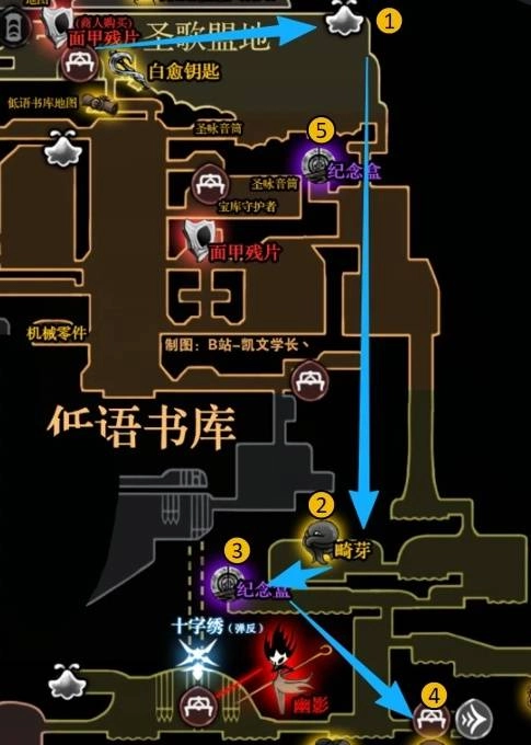 面甲碎片、雷螺、蓄力斩、盒子、捷径(撑不住的话先到椅子处存档)、跳蚤、椅子、捷径;伏特丝可以先不拿,等开了捷径存档后再获取;硬壳果;找小偷购买窃者印记;免费拿磁石骰子;(纪念盒和金属速通5小时的奖励已经拿过了)
