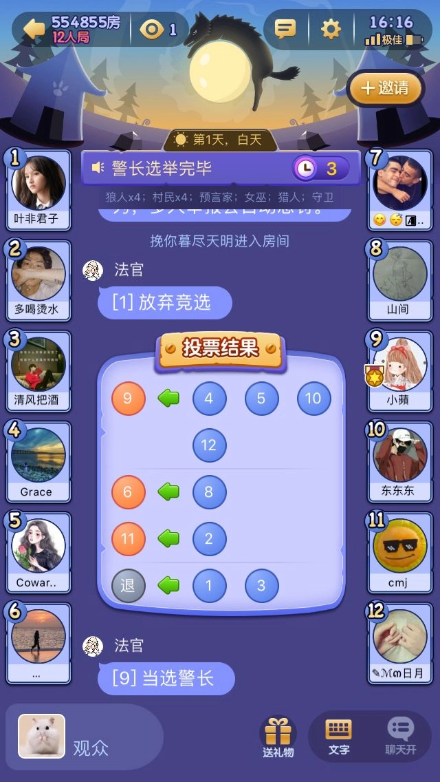 法官宣告昨夜的死亡信息,出局的玩家留下遗言。其余玩家依次发言并参与投票,票数最多的玩家将被淘汰出局。出局者及选择殉情的玩家发表遗言后,游戏便进入第二个夜晚。之后重复上述流程,直至本局游戏结束。
