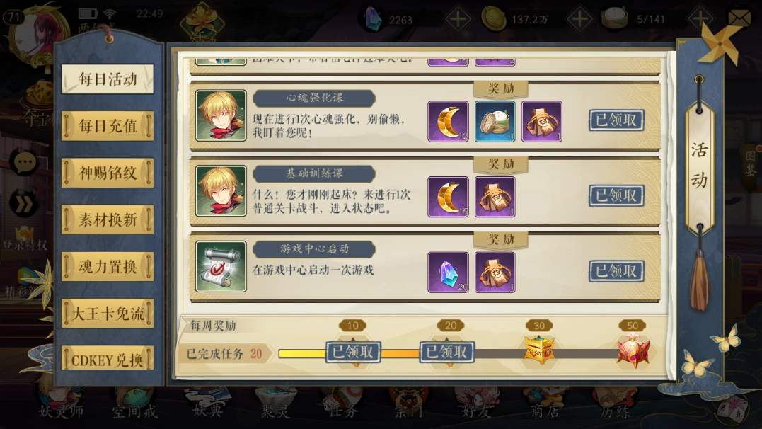 ②每日任务:完成每日任务可以获得周任务完成度,达到一定完成度系统会赠送梦魇妖壶等等大量游戏道具。