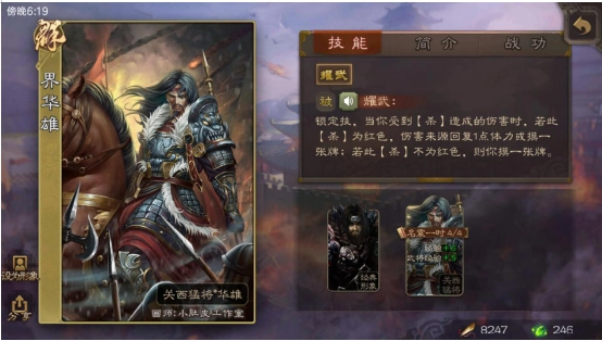 界华雄对该武将的副作用进行了调整:当我们受到的杀伤害并非红杀时,能摸一张牌。此效果与华雄自身较高的血量搭配起来实用性很强,但没必要为了触发这个技能就频繁地主动承受伤害。
