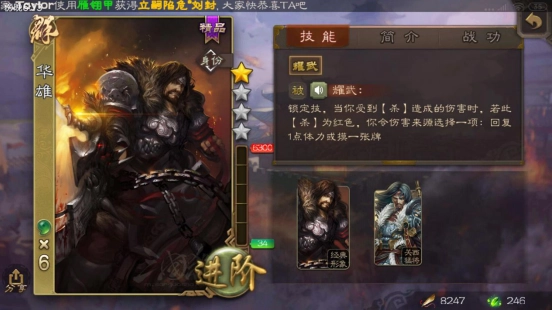 华雄堪称极少数仅拥有副作用技能的武将之一,他六点的体力上限不仅提升了手牌数量,也让他成为合格的肉盾。先来看看他的技能:当自身受到红杀造成的伤害时,可让出杀者选择——要么回复一点体力,要么摸一张牌。