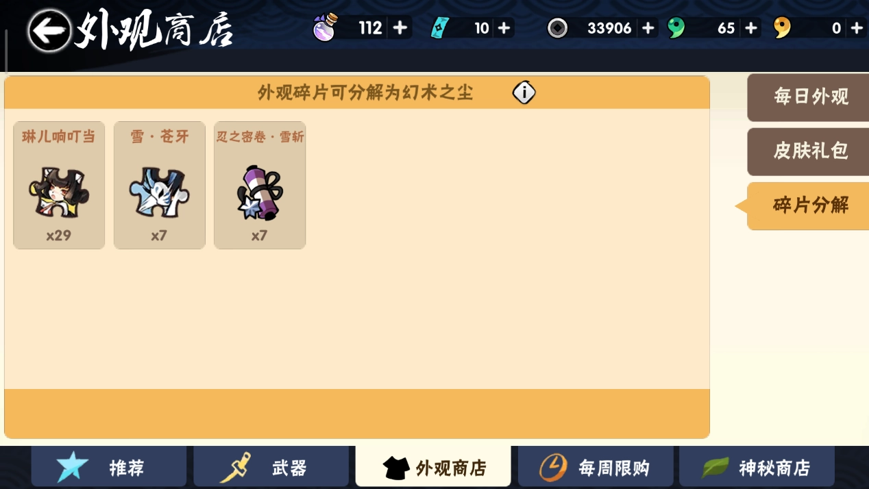 我们都清楚,兑换一个皮肤碎片得用12张外观券,获取一个幻术之尘则需要2张外观券,要是想拿到特定的皮肤碎片,还得靠运气反复刷新,这实在是件耗费勾玉的烦心事。