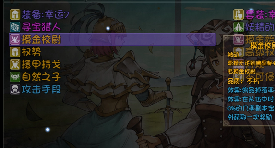 我们来看看宝藏猎人羁绊的成员构成:首先是核心角色曹操,他自带摸金校尉羁绊效果,既能提升物品掉落概率,副本里还能额外领取一次宝箱奖励,堪称这个羁绊的“领头羊”。不过曹操的技能前期偏弱,抽到后伤害不突出,得等等级提升学会“枭雄霸气”,才算得上一名合格的优秀战士。前期优先争取抽到曹操,要是没抽到,也可以用初始赠送的窃格瓦拉来凑宝藏猎人羁绊,搭配上加钱居士,就能达成20%的装备掉率加成;克洛什则属于可选角色,前期带上他也只能凑出3层宝藏猎人羁绊,实际效果和不带差别不大。