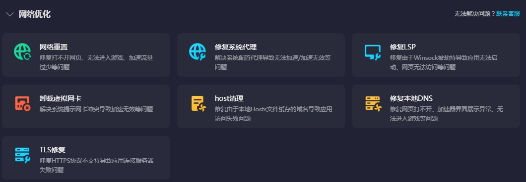 除了游戏加速功能外,它还配备了其他实用小工具来协助用户优化网络环境。在工具箱中,用户可以找到多种优化功能,比如重置电脑虚拟网卡、清理缓存等,这些功能有助于提升游戏运行的流畅度。要是这些小工具仍无法解决遇到的问题,用户还可以通过联系客服咨询解决方案,或者前往官网查看是否有相关教程可供学习参考。