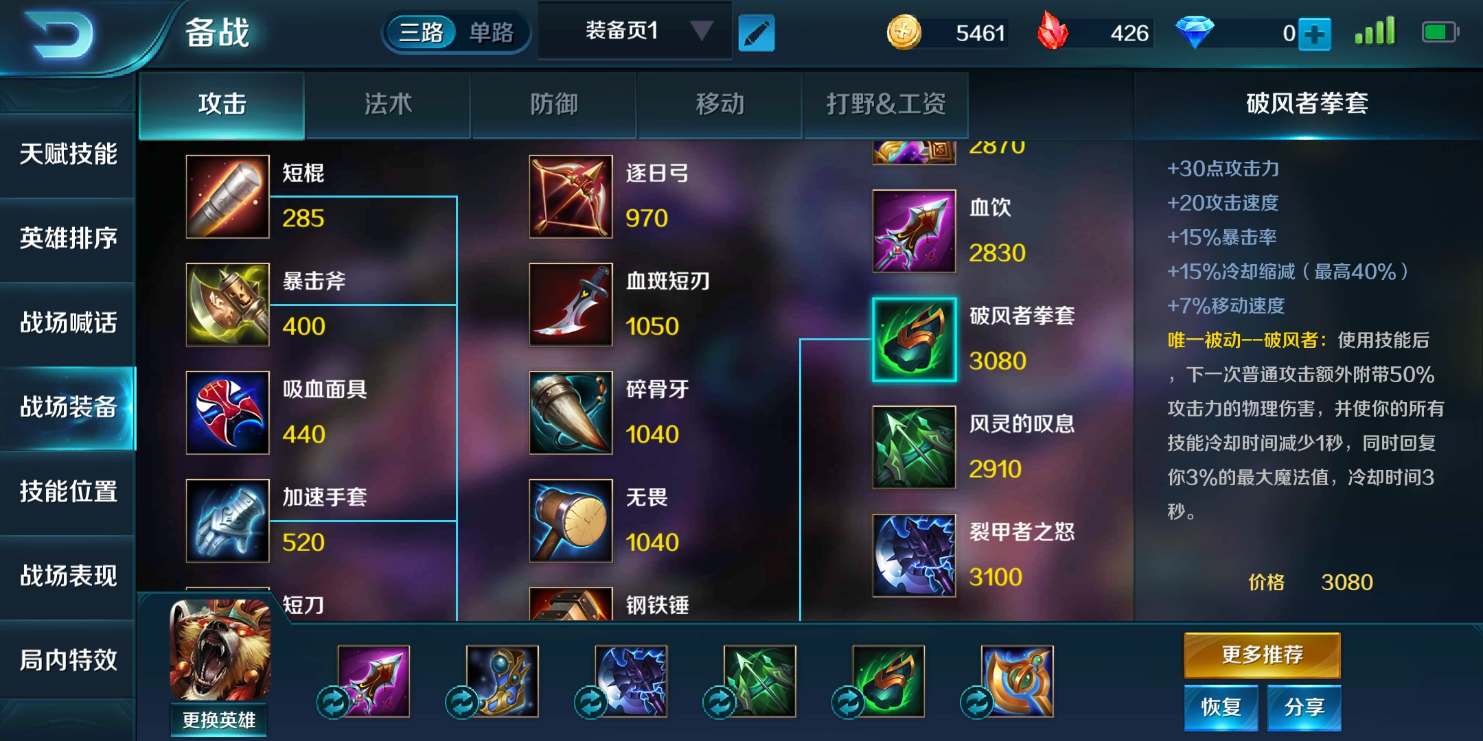 纯粹暴击流的玩法不会选择肉装,所以没办法享受到技能带来的增益效果,只能走打野位置。第一件装备选贪婪之刃,以上下双buff的方式开局,之后可以选择去反野或者抓中路和上路。第二件和第三件装备做出远古电弩和风灵的叹息,这样能进一步提升暴击率和攻击速度。