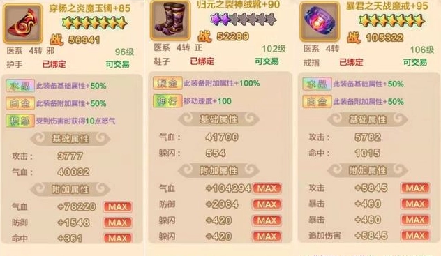 分析:护手建议穿杨,增添很多血气防御和命中,而贪狼和命门带来的闪避则无用途,因此不建议。靴子建议归元更深入增添防御,极品的紫色飘忽靴子作为衔接同样是很好的选择,戒指这儿后期仅有暴君1个属性,无需多言。