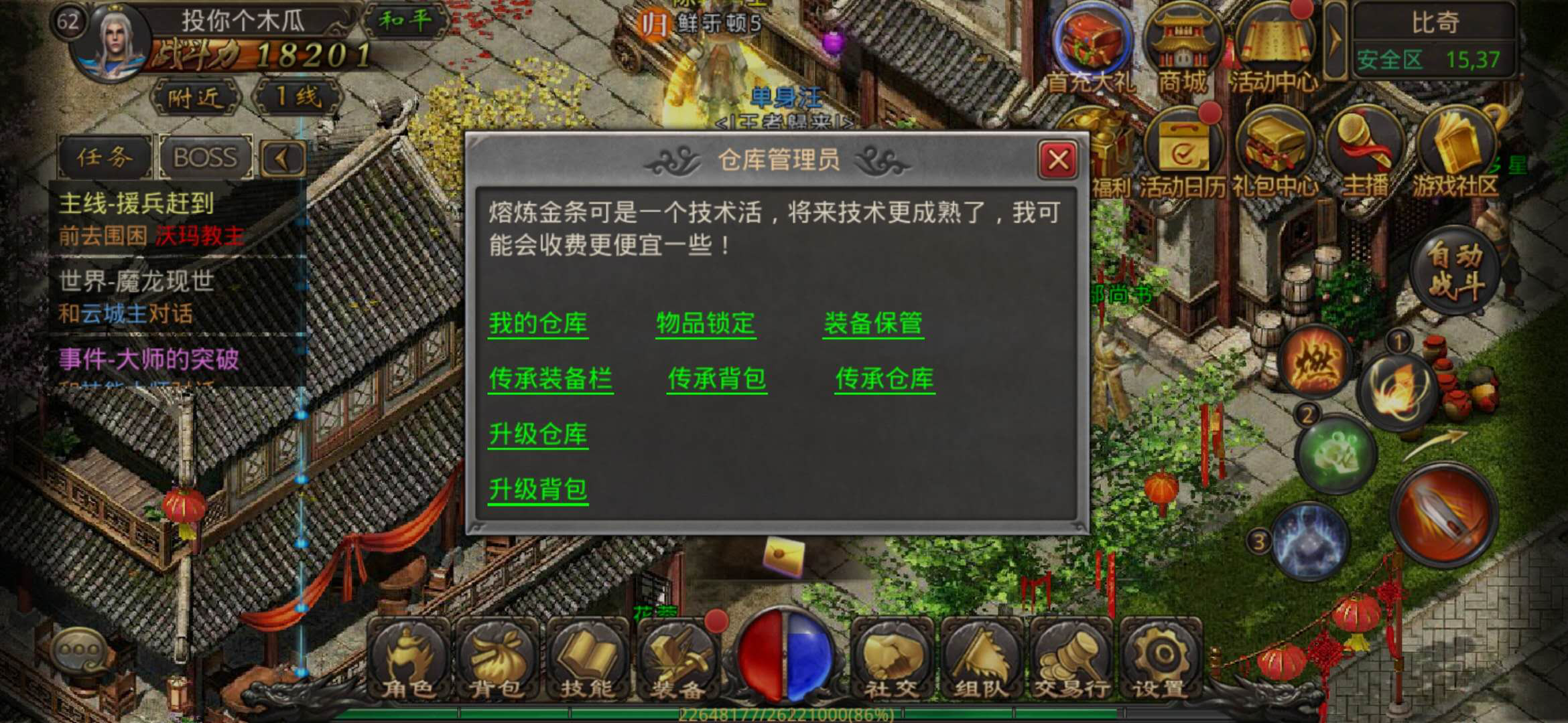 最后再提一下功能类NPC仓库管理员,他的位置在比奇城的(15.37)坐标处。在仓库管理员这里,玩家能够打开个人仓库来存放物品,还可以进行物品锁定、装备保管等操作,这里算是我们存放贵重物品最安全的场所了。所以,养成把贵重物品存进仓库的习惯是很有必要的。