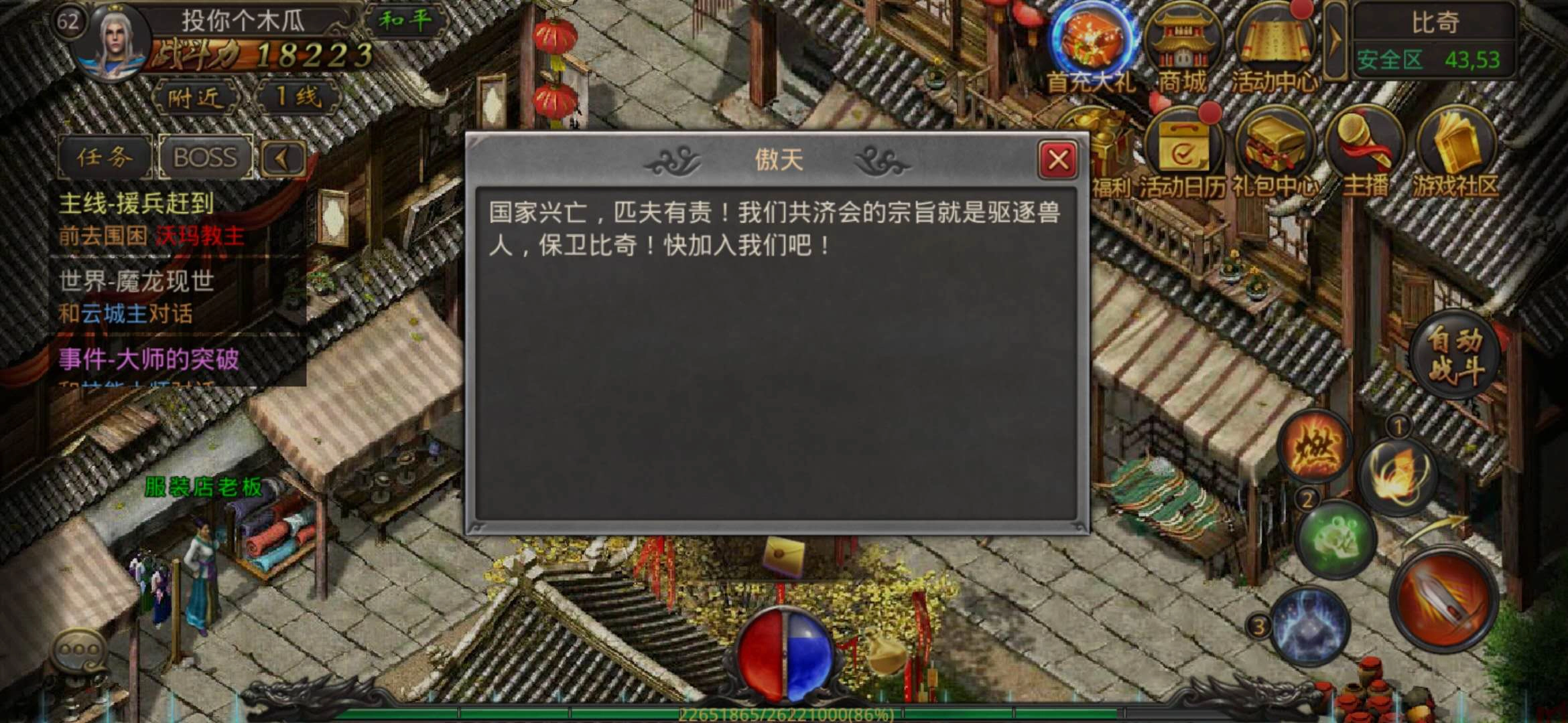 再来讲讲任务NPC,第一个是能接日常任务的傲天,他在比奇城(43.55)这个位置。日常任务是我们前期获取经验的关键渠道,因此每天准时完成日常任务,是上线之后的首要任务。