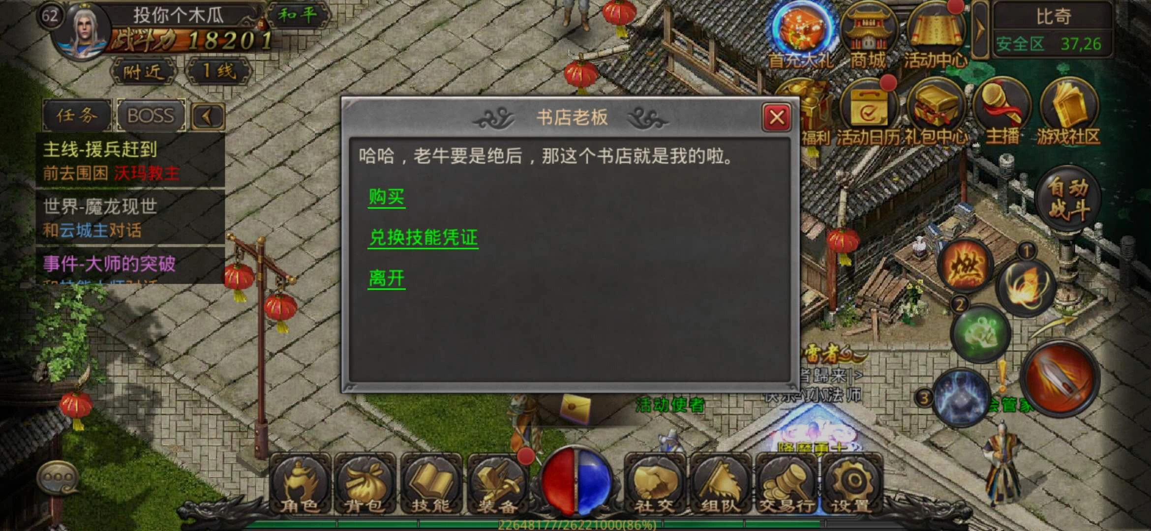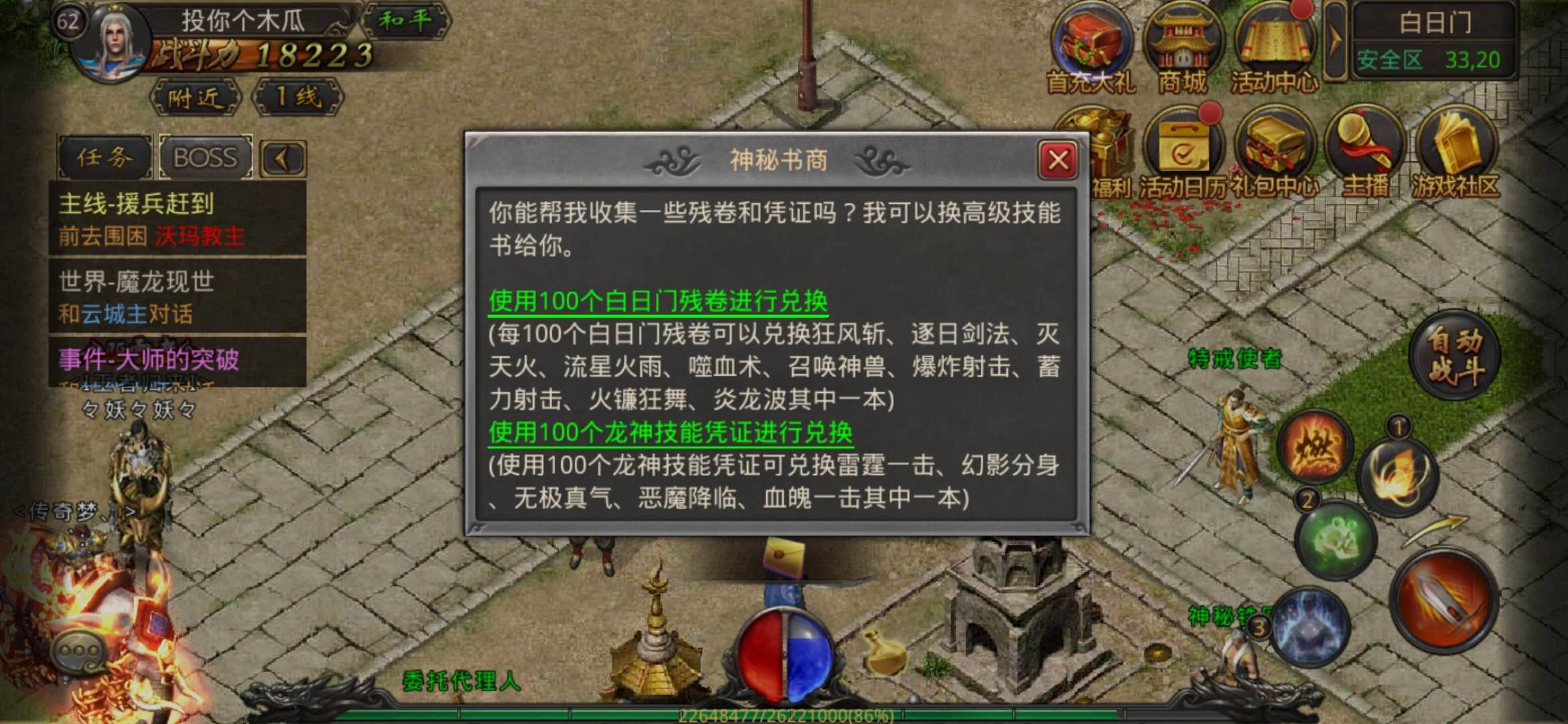 第四个神秘书商位于白日门坐标(33,21)处,在这里,玩家能够通过消耗白日门残卷与龙神凭证,兑换到各个职业的高级技能书,这无疑是获取高级技能较为便捷的方式之一。