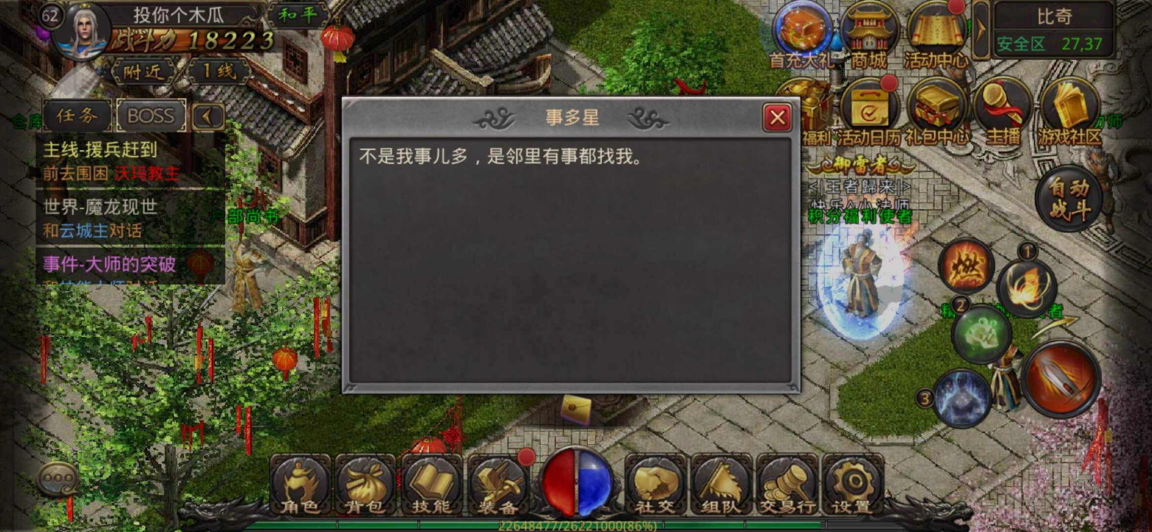 第二个是事多星和百事顺,事多星位于比奇城(27.37)坐标处,百事顺则在盟重城(37.37)坐标位置。这两个NPC都为玩家提供环式任务,是日常任务之外,玩家获取经验与金币的重要途径之一。