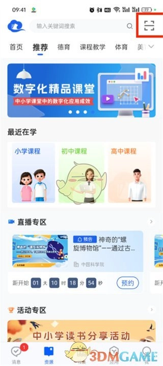 1. 第一步,打开智慧中小学软件。进入首页后,在右上角能看到【扫一扫图标】,直接点击该图标。