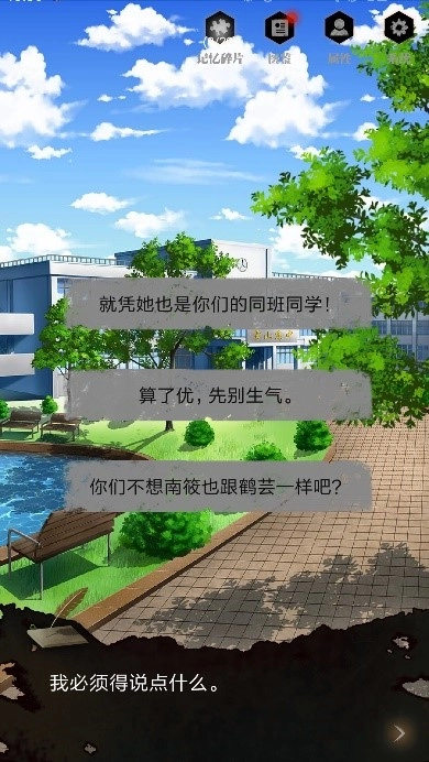 在经历了一段漫长的对话与讨论后,场景重新切换回校园。在对几位死者展开调查的过程中,出现了一处矛盾。此时界面弹出三个选项,若选择其中一个较为硬核的选项,并且以“你们不想南莜和鹤芸落得同样下场吧”这样的理由说服大家,绫星优的好感度便会提升。