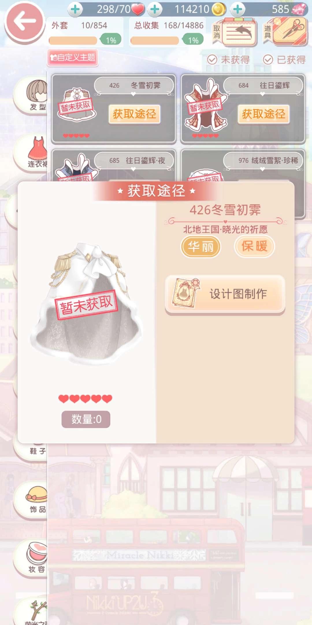 接下来要找具备保暖特性的服饰。这件五星的冬雪初霁便是不错的挑选,它兼具华丽与保暖的特性,通过设计图制作获取。制作所需材料为:1件为爱加冕、4件热夏·黑以及2件星夜颂。