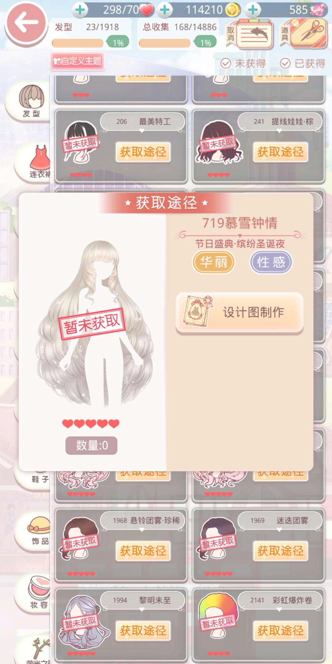 另一款推荐的发型是颇具宫廷风的暮雪钟情,风格同样华丽又性感。这款发型需通过设计图制作,制作时要用到4个摇滚女声·紫、5个庄园娇花和3个仁德。