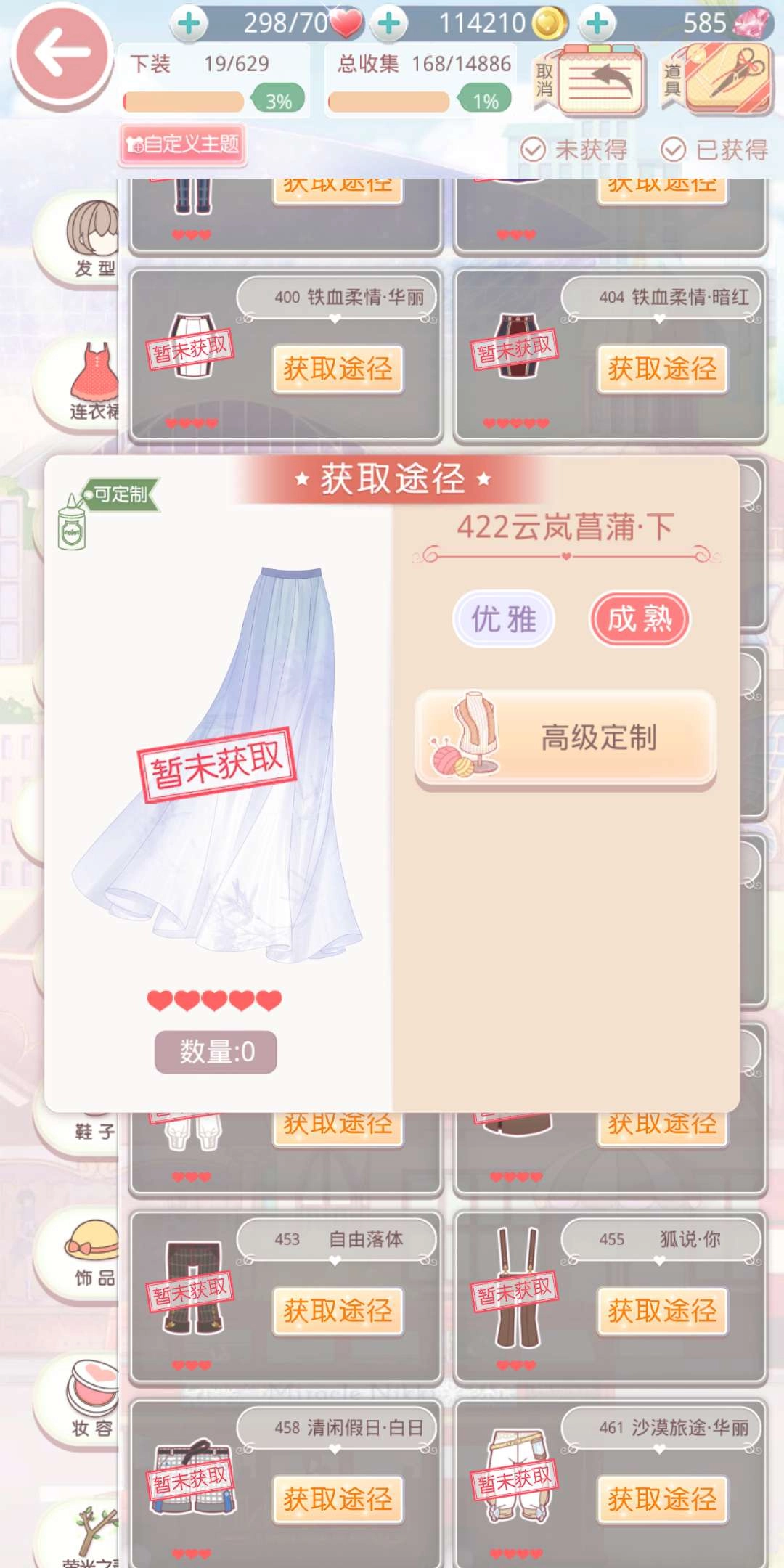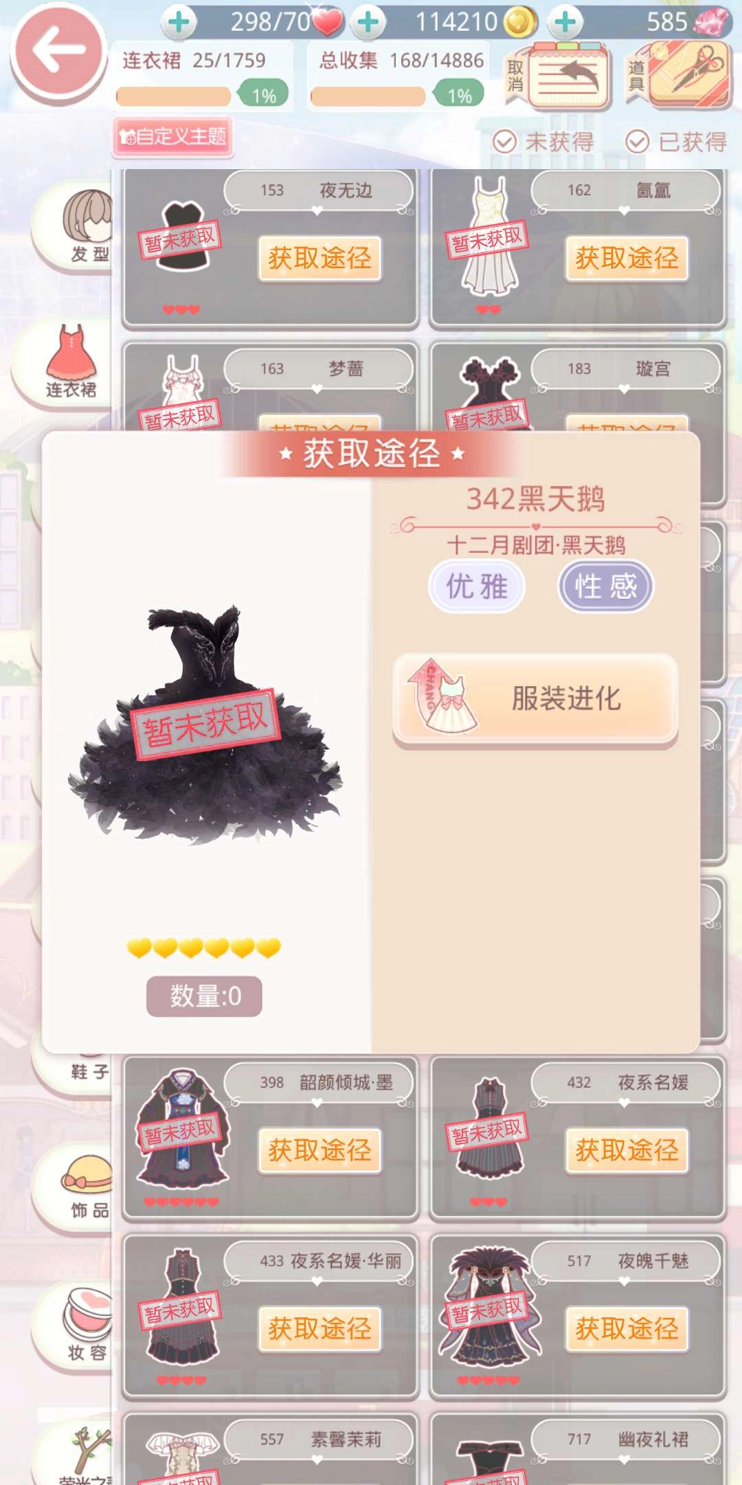 在这个主题里,裙子是最能提升表现的单品。带有金色六星元素的黑天鹅裙,对该主题的加成效果最为显著,它通过服装进化获取,而进化前需先借助设计图制作出白天鹅裙。这件裙子的制作过程颇具难度,不过能带来的回报也十分可观。