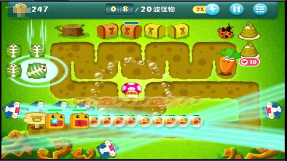 游戏里,飞机会朝这些怪物发射直线射线,怪物被射线击中后生命值会下降。通常大部分怪物还没走到第二段路程就已经死掉了,玩家在这些怪物死亡的瞬间还能获取萝卜。