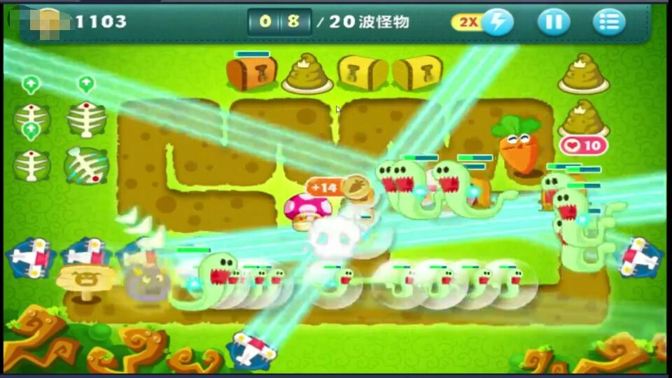 游戏的第31关总计会出现20波怪物,玩家得通过合理布局来阻挡这些怪物,同时还得确保萝卜不被啃咬才能顺利通关。这些怪物在初期体型很小,移动速度也比较慢,因此玩家对付它们只需在周围布置飞机就行。