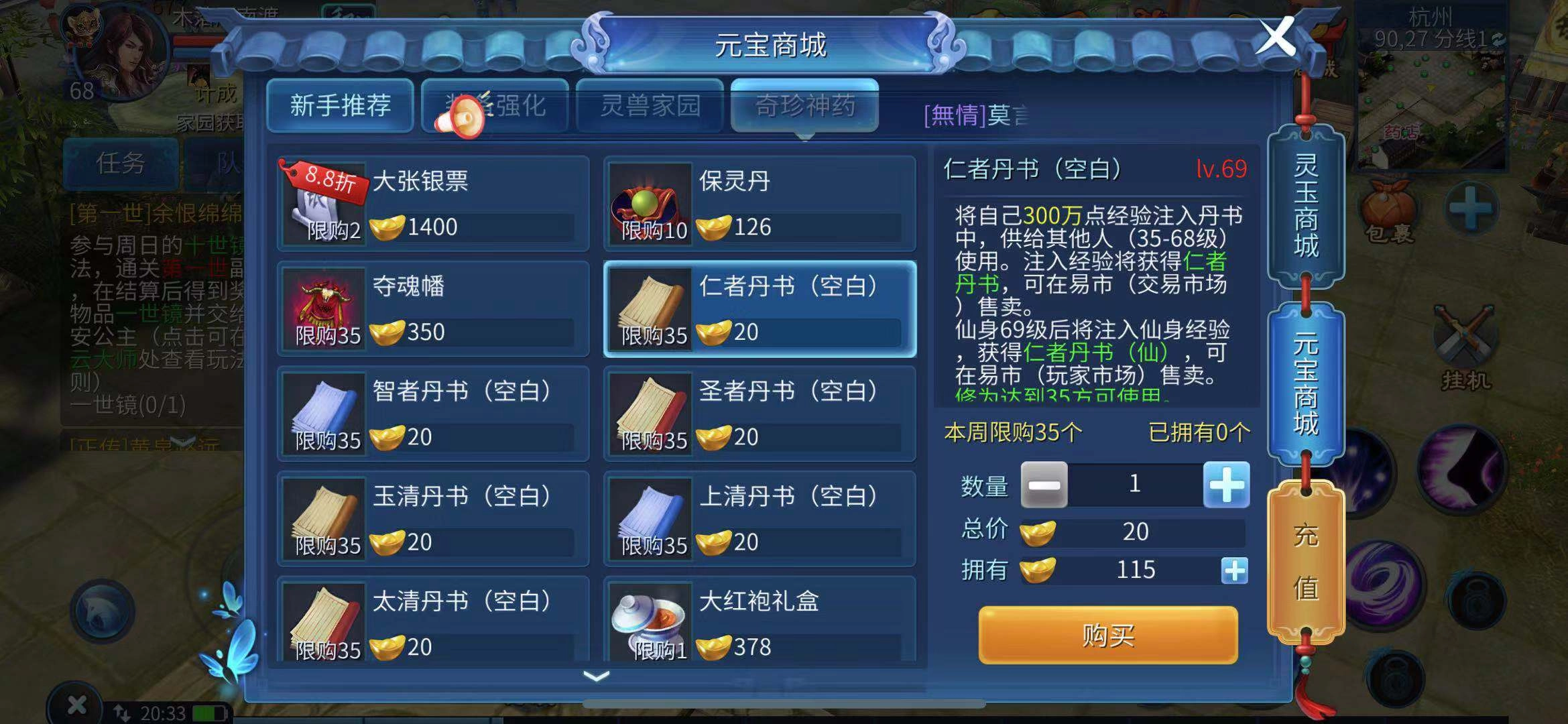 玩家要获取经验丹书,首先得从商城或门派挑战商店里拿到空白的经验丹书;其次,只有等级达到六十九级,才能给丹书注入经验;完成经验注入后,就可以将丹书出售了。经验丹书的等级越高,能卖出的元宝就越多,但对应的注入经验要求也越高——最低级的丹书需要注入一百多万经验,等级往上每提升一级,所需的经验量也会依次累加。