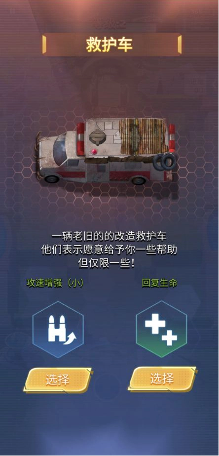 每次升级都会出现三个可供选择的技能,这在副本推进关卡时至关重要。就像下方显示的三个技能图标,初期优先选择装填相关的升级会更有利,因为后续无论是冰冻还是炙热这类技能都能从中获益;此外,提升射击的前向范围或是增加连续射击次数也是不错的选择。另外,每隔几关会遇到救护车,要是我们的血量不够,还是得借助它回复生命值。