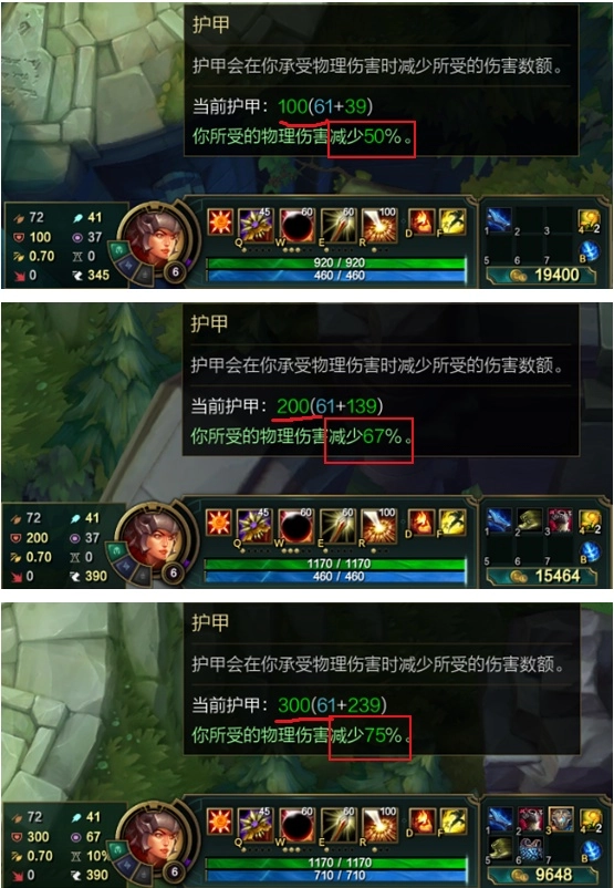 可以看出护甲越高,免伤效果的提升幅度就越小。这里要提醒大家,不必一味地堆护甲,堆到一定程度后免伤收益就很难再提高了(敌人有暴击情况时除外)。