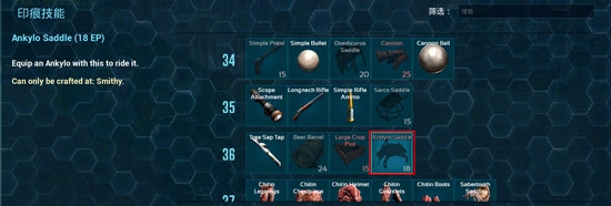 这个阶段属于新手期,印痕点主要都用来学习生存工具了,建议大家优先选择这几个:10级的淡水碳龟鞍具、16级的三角龙鞍(一定要学)以及26级的剑龙鞍。淡水碳龟能满足前期的需求,等能骑三角龙后,浆果就足够解决吃喝问题了,先顺利熬过新手阶段。