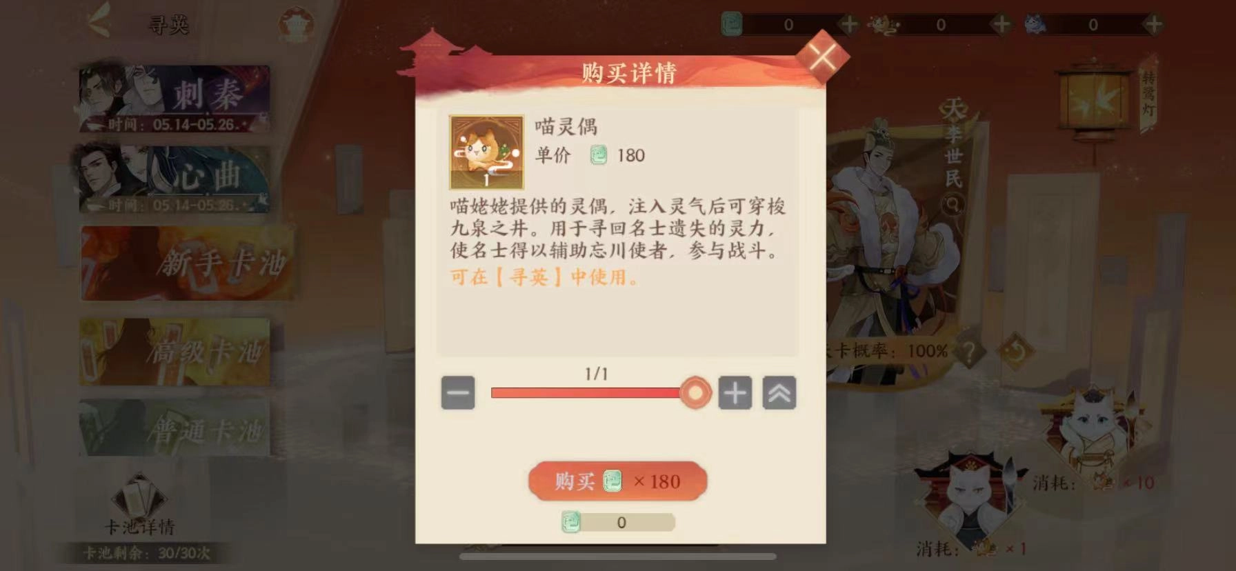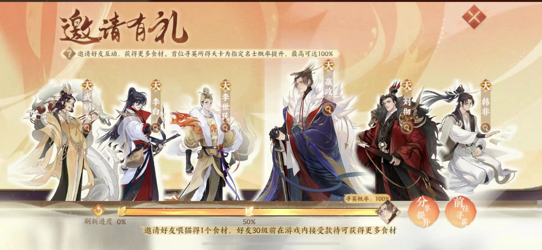 玩家初次进入游戏时,游戏内会弹出一个新手卡池,该卡池的机制是玩家必定能抽到一张天卡,这张天卡的可选角色范围包括嬴政、武则天、李白、李世民、刘彻和韩非。我选择的角色是李世民,选定后点击页面上的“前往寻英”按钮,之后在这个卡池累计抽取满30次,就能确保获得李世民了。