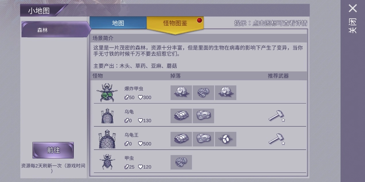 当大家合成药剂时,除了要找到草药,还得攻击这里的甲虫获取甲虫囊这一材料才行。在森林区域,还能攻击爆炸甲虫、小野猪和乌龟,战胜它们就能得到毒囊、野猪筋、野猪皮、龟壳之类的必备材料。