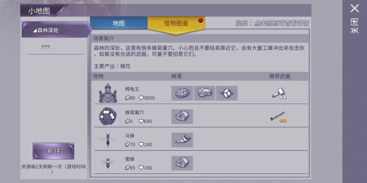 再往后应该就到了森林深处,在这里的难度会升级,大家会遇到一些鳄鱼、马蜂和蜜蜂,通过打败他们大家也能够获得一些制作食物的蜂蜜,通过进攻鳄鱼王有可能还会得到一些永久血量。