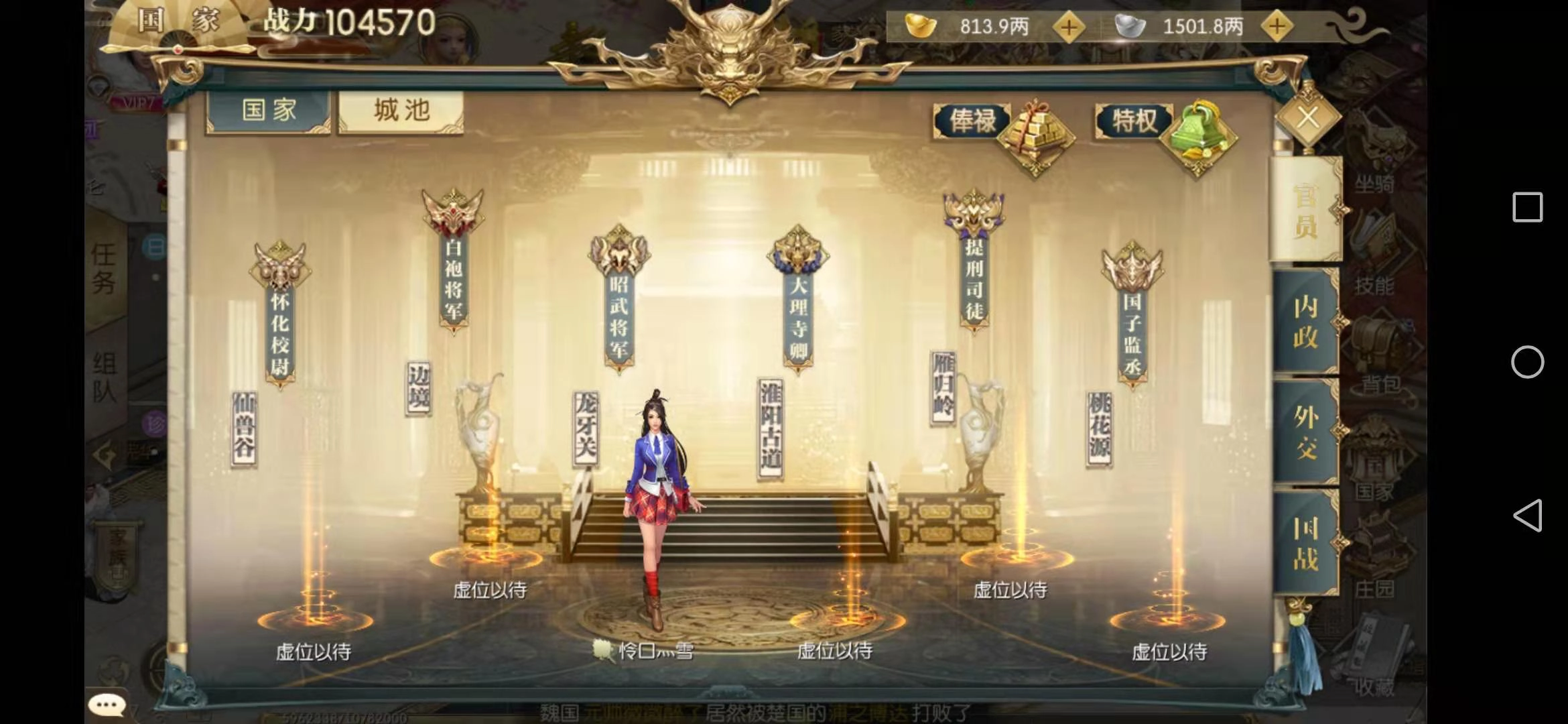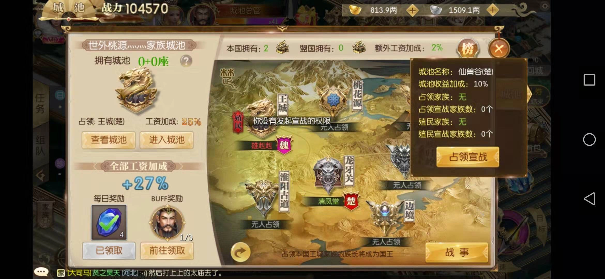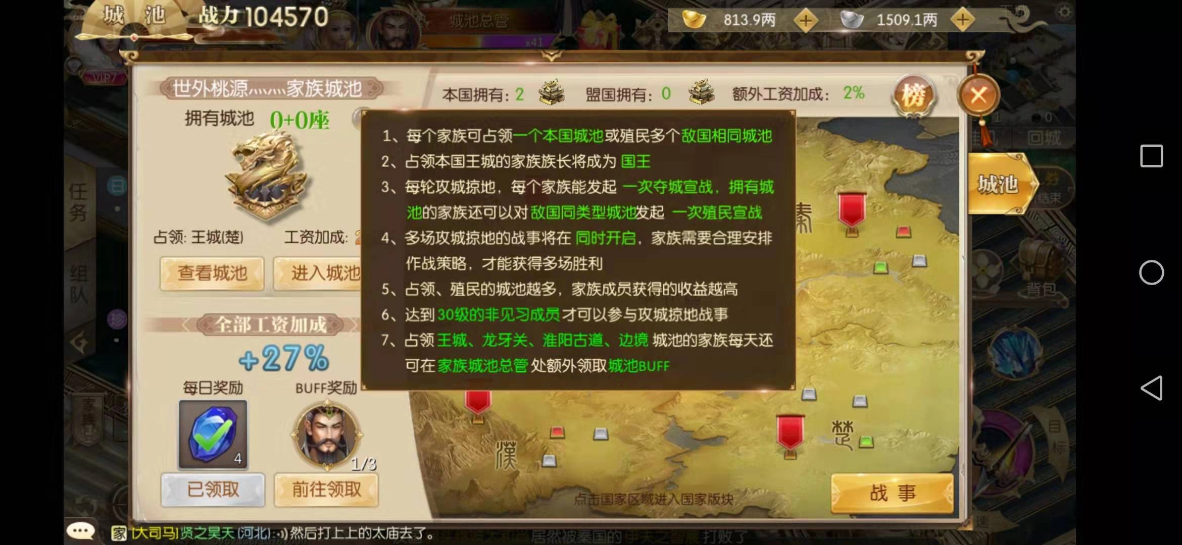 游戏内设有7座可供占领的城池,包括王城、桃花源、仙兽谷、雁归岭、龙牙关、淮阳古道,每座城池的城主均有权任命一名特殊官员,家族成员每日可在家族福利界面领取洗练石奖励及该城池对应的BUFF奖励。