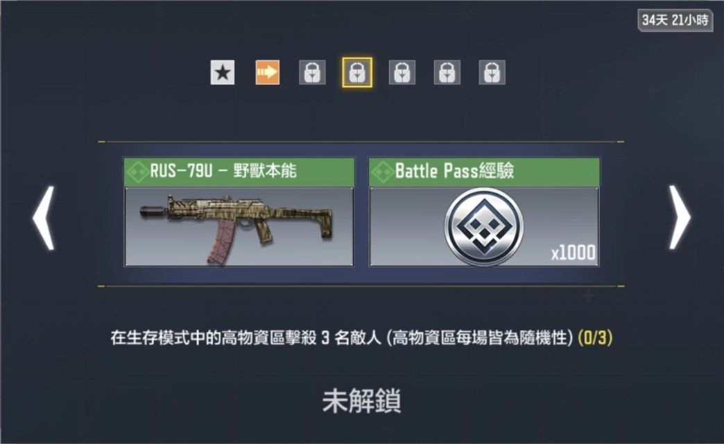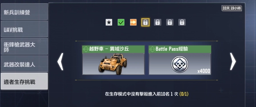 玩家在游戏主页面打开赛季任务,就能看到下属的生存之道系列任务。这个系列里的每一页都有一个挑战,玩家必须完成当前挑战,才能解锁对应的奖励和下一页的挑战内容,整个过程不支持选择或跳过。