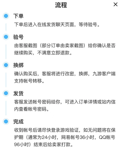 平台的流程同样清晰透明,从下单起,小伙伴们就能清楚看到,整个流程除了验号和换绑环节,就是发货步骤;交易期间客服会全程协助双方,特别是验号和换绑阶段,由客服提供相关截图,买家核实无误后即可直接进行换绑操作,完全无需双方自行解除,让交易更省心。