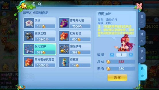 对于想要打造极品神兽并参与比武的玩家而言,高级必杀是必不可少的搭配。玩家可在商城购买银河加护或阳光护符进行洗练,直至洗出高级必杀技能。需要注意的是,另一个技能不能是连击、凝神这类会降低物理伤害的技能。